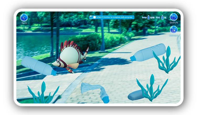 A calm, meditative AR experience where the player controls a single fish by tapping the screen and collecting floating PET bottles within a small domain. Bottles continuously respawn to maintain 4–5 in the scene, providing a relaxed way to practice controls and enjoy environmentally themed gameplay without time pressure.